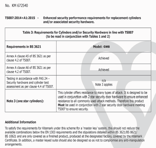 تم تصنيف أسطوانة GMB One Star Cylinder في TS 007 KITEMARK وفقًا لتصنيف النجوم منذ عام 2017.