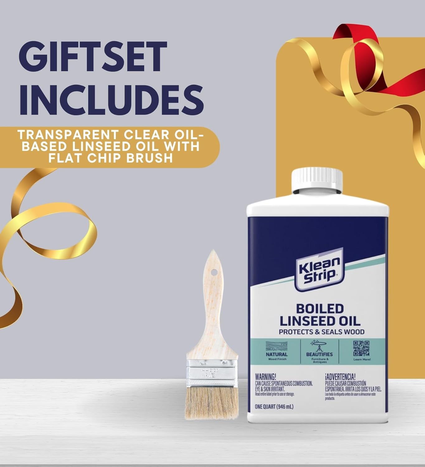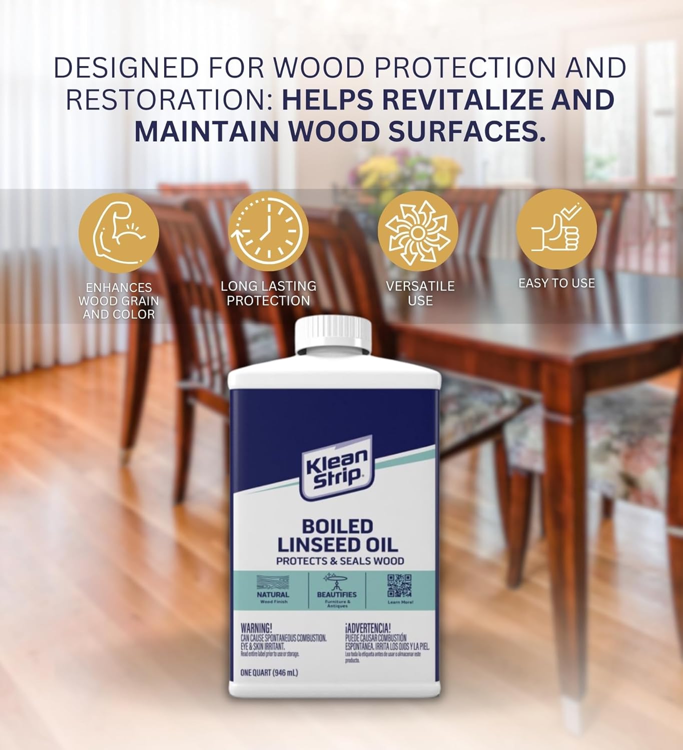 - زيت بذر الكتان متعدد الاستخدامات للخشب في الهواء الطلق - يعمل زيت بذر الكتان المغلي من Klean Strip على تعزيز متانة ومظهر الأسطح الخشبية الخارجية، مما يوفر مقاومة ضد علامات المياه والخدوش والتشوه.