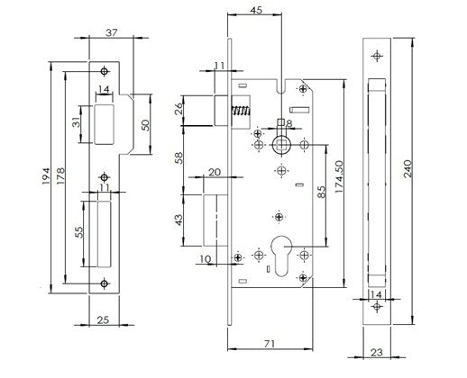 | مجموعة قفل مزلاج من سلسلة كلاسيكا، علبة قفل 85×45 مم، أسطوانة 70 مم (35/35) | 22-8545-S70-KK-31-11 |