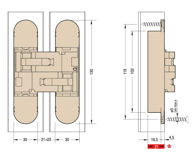 - 3D concealed hinges: with a gap between the two wings of 23mm, 1230s is the ideal solution for reversible doors or to go around skirting boards or trims or claddings.