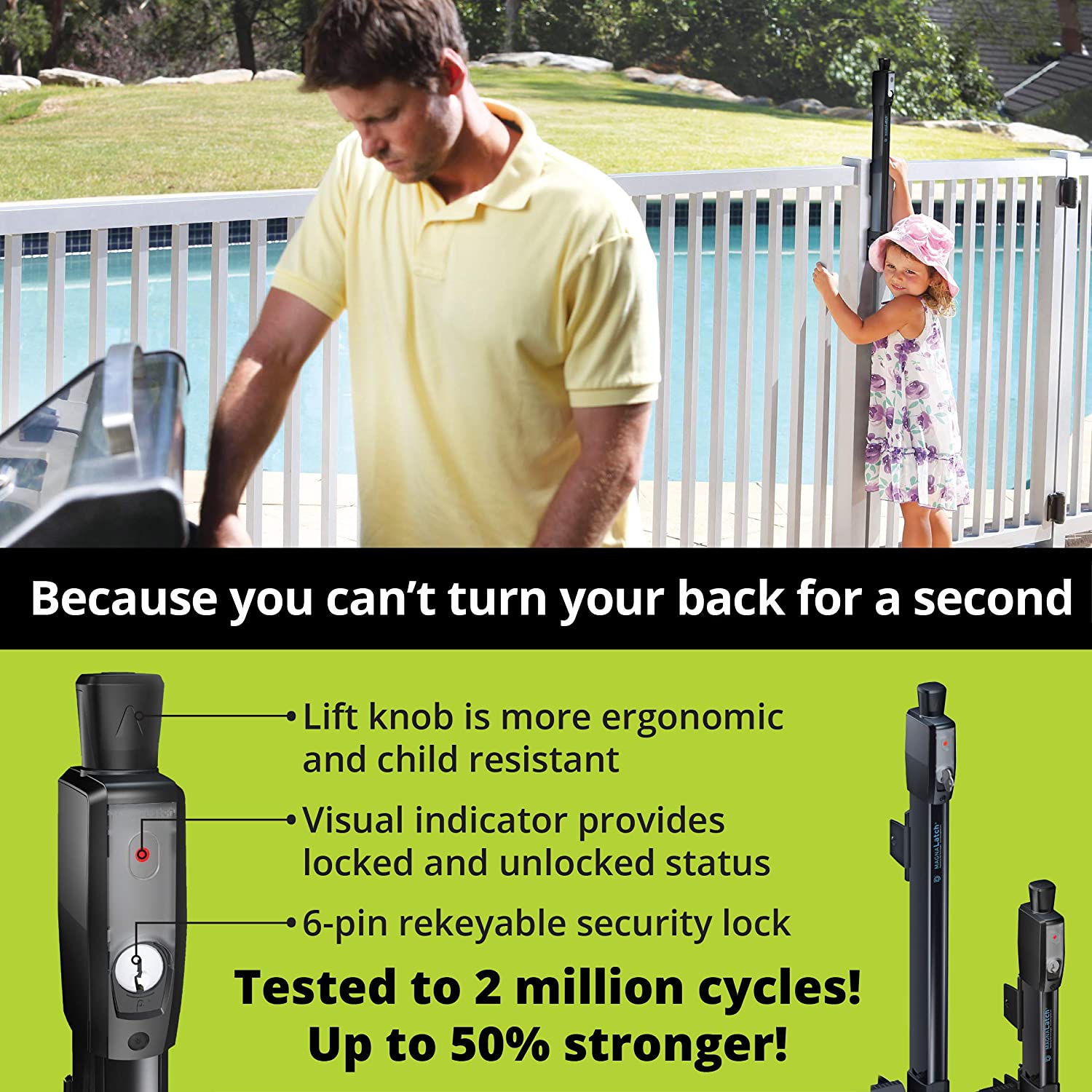 - Key lockable for peace of mind; can be used with pool gates, sheds, and fence gates