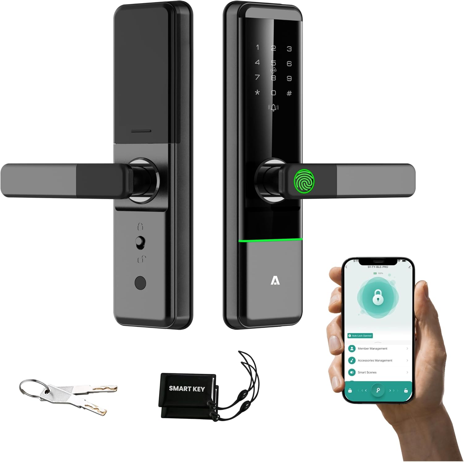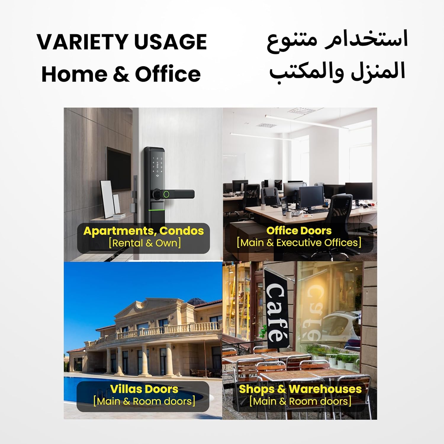 - 5-in-1 Unlocking Methods – Unlock your door with Fingerprint, PIN Code, RFID Card, Tuya App, or Mechanical Key. Perfect for modern households, offices, and rentals.
